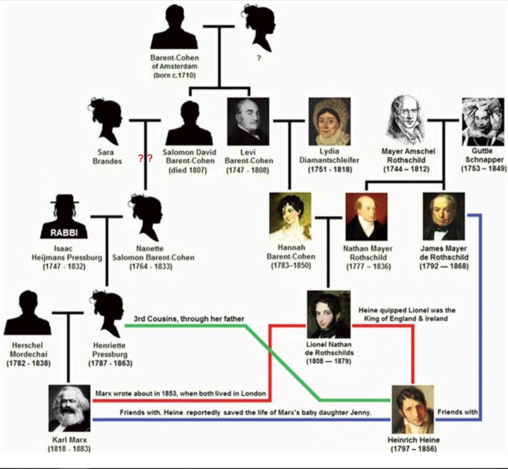 Another potential source of Marx’s Jewish pride was the Rothschilds, though this connection remains speculative. Wikipedia, some Jewish sources and genealogical websites suggest that Marx’s grandmother, Nanette Salomon Pressburg (née Cohen, 1764–1833), was the daughter of Salomon Barent Cohen, whose brother Levi’s daughter, Hannah Barent Cohen, married Nathan Mayer Rothschild in 1806. This dynastic union strengthened ties between the Barent Cohen and Rothschild families. If true, Nanette’s daughter, Henriette (Marx’s mother, 1788–1863), would have been a second cousin to Hannah’s son, Lionel de Rothschild, sharing a common great-grandfather, and Karl Marx would have been Lionel’s third cousin. Numerous unsourced family trees depict this alleged Rothschild connection. Here is one example with red question marks added.