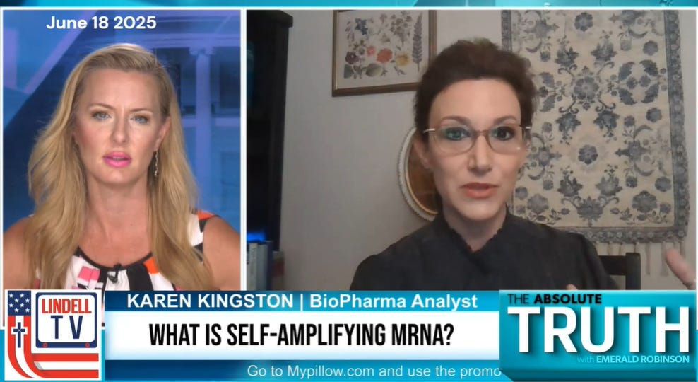 If you’d like to help fund The Kingston Report, please buy me a coffee. Thank you! I appreciate you. The Truth About mRNA Was Silenced. But Why Is It Still Being Tempered?The reason why people were not willing to listen to the truth that mRNA injections are biotechnology weapons is because not enough people were willing to tell them the truth. It's that simple.June 23, 2025: Pfizer experimented on millions of human beings with 12 vaccine candidates, including self-amplifying mRNA (saRNA), which is highly infectious through shedding. saRNA is also biotech’s foundation for biosynthetic pathogens that can replicate inside the cells of animals, or what we call ‘coronaviruses’. While the FDA is announcing the fast-tracking of saRNA vaccines, billions of people worldwide have already been infected with the weaponized saRNA biotechnology. "Everything's Been a Lie."Last week I had the honor of being on The Absolute Truth with Emerald Robinson, to discuss the biopharma-industrial complex’s biotech attack on humanity and how everything we’ve been told about the SARS-2 coronavirus and mRNA has been a lie. Check out this 3-minute clip. The saRNA references I speak to in this interview can be found in this article. The Absolute Truth with Emerald Robinson on LindellTV.comYou can watch the full interview on LindellTV.com starting at 31:00:00 (31 minutes mark). https://lindelltv.com/americas-rigged-elections-exposed-in-court/?channel=4722Please follow and support the work of Emerald Robinson by following her on X or her SubStack Emerald Robinson. “It’s All Been Criminal”In October of 2021, I had an in-depth conversation with Brannon Howse discussing the criminality of the PREP Act, the criminality of the government’s COVID-19 mandates and lockdowns, and the criminal use of mRNA bioweapon injections on American adults and children under the guise of “safe and effective vaccines.” Take a listen to this 2-minute clip. You can support and follow Brannon Howse at WorldView TV. What Do We Do Next?It’s important that we continue to share and speak the truth about the dangerous use of mRNA and saRNA nanoparticle technology and other dual-use nanotechnologies. Why? Because the US government and HHS have big plans to continue to expand the use of the mRNA nanoparticle technology on all of us. Whether it’s;
