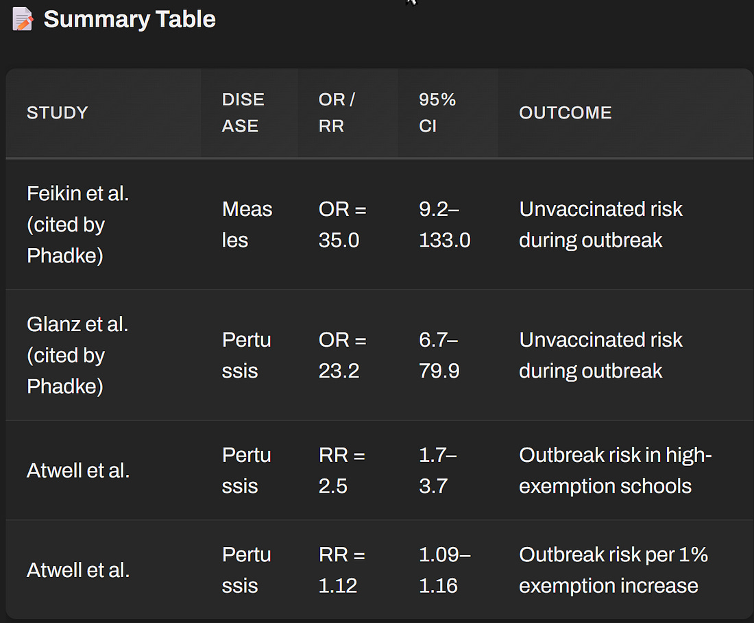 (ORs, CIs, or case studies) showing that unvaccinated children cause