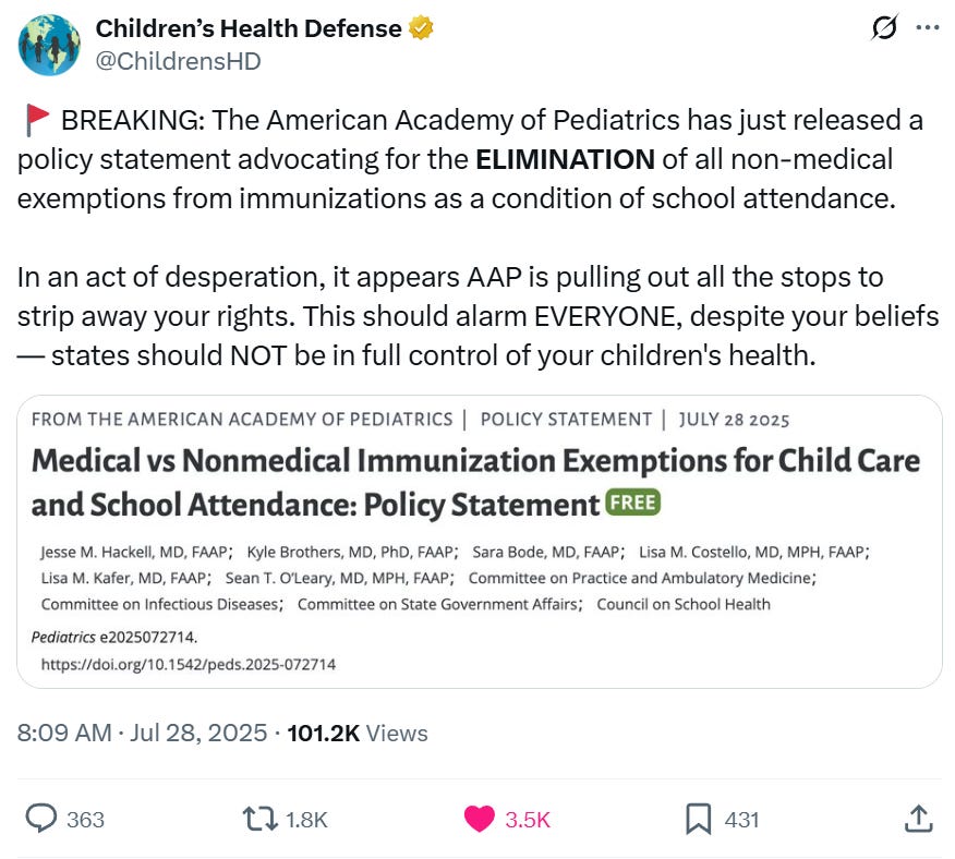 AAP just issued a policy statement directing all states to require vaccination for all kids who attend school, except those with legit medical exemptions: