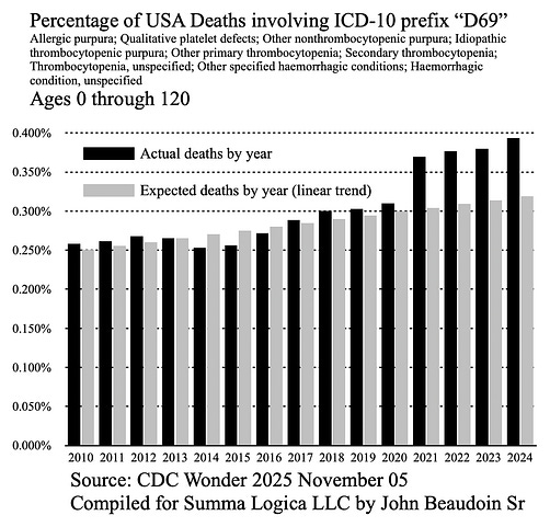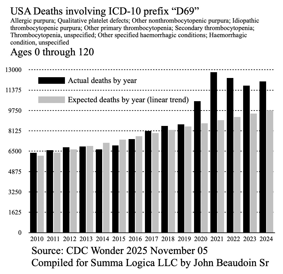 Figure 1 depicts total deaths in USA for years 2010 through 2024 involving ICD-10 Code prefix “D69,” which includes, “Allergic purpura; Qualitative platelet defects; Other nonthrombocytopenic purpura; Idiopathic thrombocytopenic purpura; Other primary thrombocytopenia; Secondary thrombocytopenia; Thrombocytopenia, unspecified; Other specified haemorrhagic conditions; Haemorrhagic condition, unspecified.” (thrombocytopenia dominates this code set in quantity)