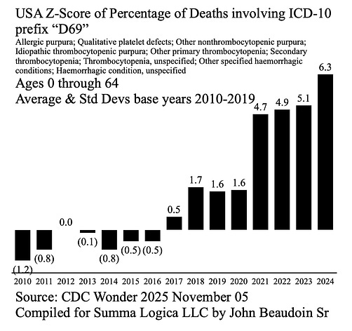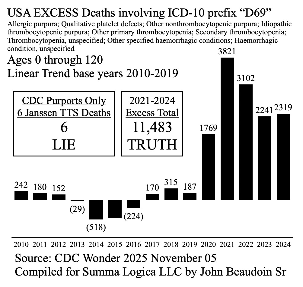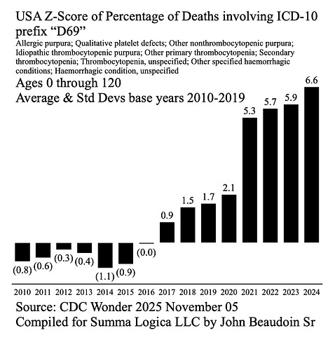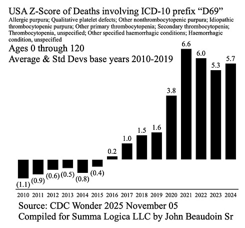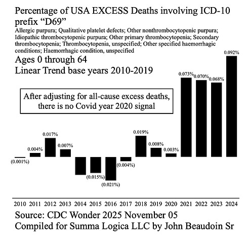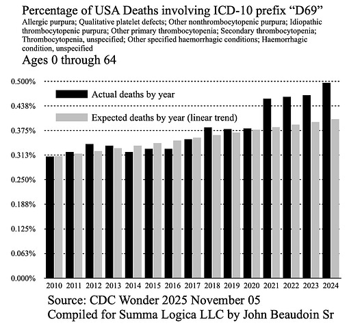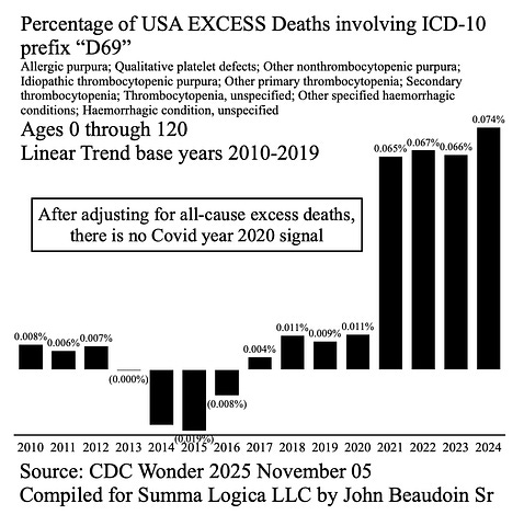 Having a few moments for a respite, I dove into CDC Wonder. I sought to support what I said in the recent October 22, 2025 Joint Committee hearing in Massachusetts, which was that there are 10,000 excess thrombocytopenia involved deaths in USA since the Covid vaccines and 30,000 excess pulmonary deaths.