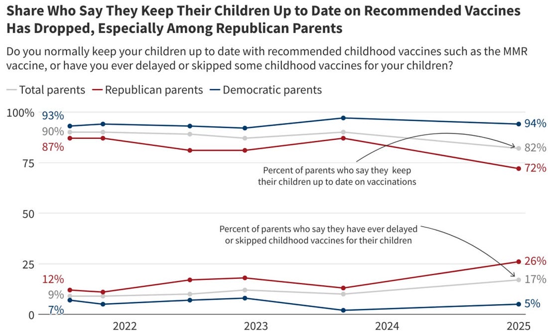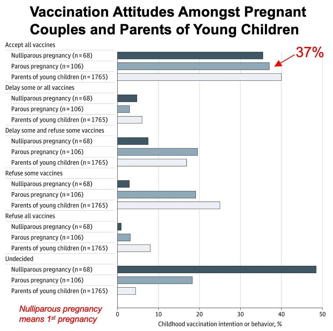 As COVID had been such a severe overreach, I had hoped that the COVID cartel’s greed would awaken people to the issues with vaccination and prompt significant skepticism against the existing pediatric vaccines. However, I did not expect such a large shift to occur so quickly. To briefly put this in context: First, while there has been an overall loss of trust in vaccination (which I consider to be absolutely profound), the drop in confidence is much greater among the youngest generation, who are actually making the decisions to vaccinate their children. Consider for example, the results of this January survey, where far more than 37% of all Americans fully trusted and intended to follow the CDC schedule. Second, a total of 37% of American parents fully trust the schedule, which represents a massive drop compared to the historical baseline. Specifically: •In 2000, 19% of parents had “concerns about vaccines” The key context to understand about these figures is that they were alarming to the medical field, as their baseline had been to expect almost all parents would vaccinate without complaining and if someone dared to step out of line by doing something as simple as delaying vaccines (as more vaccines close together at a young age increases the likelihood of an injury) they were crucified by the medical field and often lost their licenses. As such, if you consider the figures they were alarmed by, and then compare them to the current reality, the difference is essentially “night and day.” Third, a major way vaccine compliance is enforced is through social pressure (e.g., “everyone else is doing it, so you must be crazy or a bad parent if you aren’t”) and mandates. Both of these are predicated on the majority of the population being vaccinated, which essentially is why the medical industry was so concerned about vaccine use dropping below 90%. As
