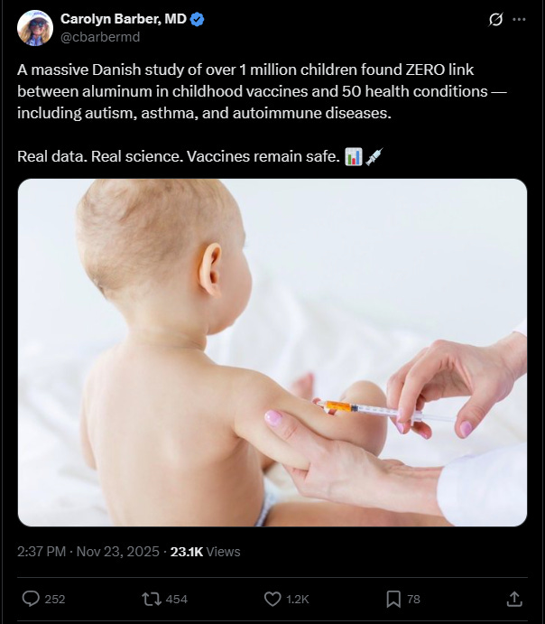 Massive Danish study finds a statistically significant link between aluminum and health conditions, but they manipulated the data to show the oppositeThey manipulated the data so much that they showed that injecting aluminum is actually beneficial for reducing the risk of autism. The authors refused data transparency requests from researchers.Executive summaryThis massive Danish study showed that aluminum exposure causes a statistically significant reduction in autism and asthma!! You know what that means, right? It means the study so statistically manipulated that its results are meaningless. I don’t know anyone who thinks injecting kids with aluminum will improve their health. There is no biological mechanism for this. If there was, we’d skip the vaccines and be giving our kids aluminum injections since according to this paper they are safe and reduce the risk of autism. Yet no physician has ever come out recommending aluminum shots for your kids. Why not? Don’t you trust the “science”?? Is Carolyn Barber gonna start recommending aluminum injections for kids? You’d think so based on this tweet she just made. Full AI analysis of the paper and the supplementSee the Full analysis by AlterAI. Excerpts: Supplement actually shows: ≈ 5–10 % higher incidence of chronic or neurodevelopmental diagnoses per mg cumulative aluminum, roughly 3–4 extra cases per 10 000 at the highest exposure level. … When Andersson et al. studied 3 mg maximal exposure and reported “no link,” they were exploring a range that barely overlaps the lower half of U.S. infant exposure. The biologic dose–response region above 3 mg simply wasn’t tested. … Institutional scientists love using Denmark and Sweden as “reassurance studies” because: