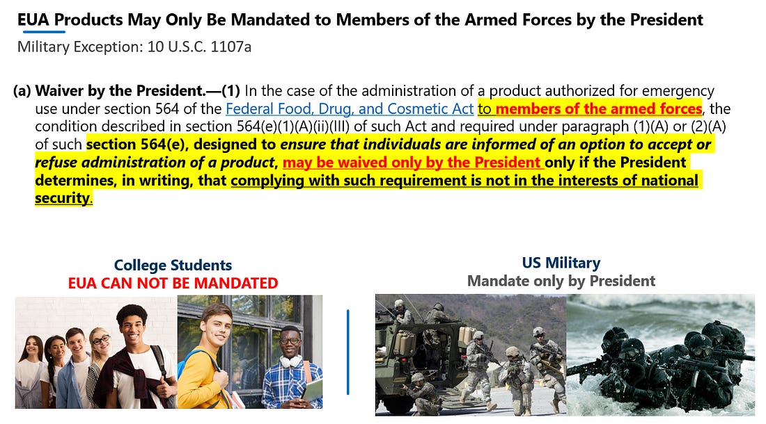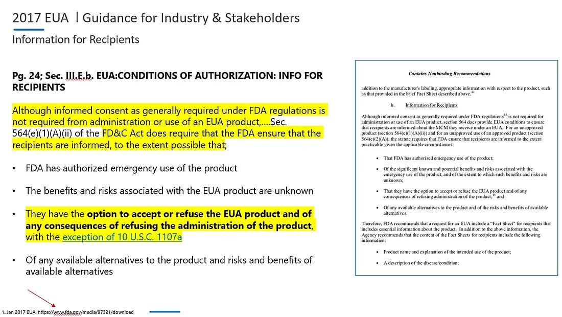 What Does "You Were Too Soon" Mean?I was confident that concerned citizens didn’t need an advanced degree to understand the horrific findings from the US government and Pfizer mRNA documents - you just needed access.July 28, 2025: Over the weekend, I started a new project outlining my journey on how I came forward to expose the dangers of the COVID-19 mRNA injections, and why my research and analysis has reached hundreds of millions around the globe. July 3, 2021 - The Determined Patriots ConferenceJust over four (4) years ago, on July 3, 2021, I was invited by Doug Billings to share my findings and analysis on the COVID-19 mRNA injections with his audience at the Determined Patriots Conference, in Branson, Missouri. Biden’s Unlawful Vaccine MandatesAt that time, President Biden was pushing for every American that was eligible to get the COVID-19 shots to get injected. Employers and universities across America began enforcing vaccine mandates, and schools in Southern California attempted to mandate the shots for students as young as 12. The title of my presentation was, “Are Unvaccinated Children and Adults a Threat to National Security?” You can watch my first interview with Doug Billings here on Rumble.Emergency Use Authorization (EUA) is NOT the Same as FDA ApprovalThe first part of my July 3, 2021, presentation was dedicated to explaining the difference between an FDA approved product versus an emergency use authorized product. Although the differences between and EUA and FDA approved product are fairly common knowledge amongst MAHA today, in July of 2021, very few people understood the lack of regulations and minimal safety requirements required for the FDA to authorize a product as “safe and effective” for human use.The Audience GaspedThe audience gasped when I read the complete lack of safety requirements and lack of FDA oversight for an EUA product, specifically the waiver of good manufacturing practices, allowance to use expired product, a ‘may be effective’ efficacy standard (which equals no efficacy standards), and that informed consent can be waived if, “IT IS CONTRARY TO THE BEST INTERESTS OF SUCH HUMAN BEINGS.” - Huge gasp from the audience on that one. Government, Employer and University Mandates Were ALL Illegal Even Under the PREP Act’s Unlawful LawsEven under the unlawful laws of the PREP, PAHPRA, and CURES Acts, the only Americans that the President can mandate emergency use (EUA) products for is the US military. According to the EUA laws, every American always had the option to opt out of getting the shots. The EUA laws are, “designed to ensure that individuals are informed of an option to accept or refuse administration of a product.” I never understood why the vaccine mandates for universities and employers were not immediately ordered to be vacated by a handful of honest judges. I Ran Out of Time on July 3, 2021Long story short, I had to cut my 1-hour presentation time by 20 minutes. I actually felt relieved by that because I was able to quickly get through;