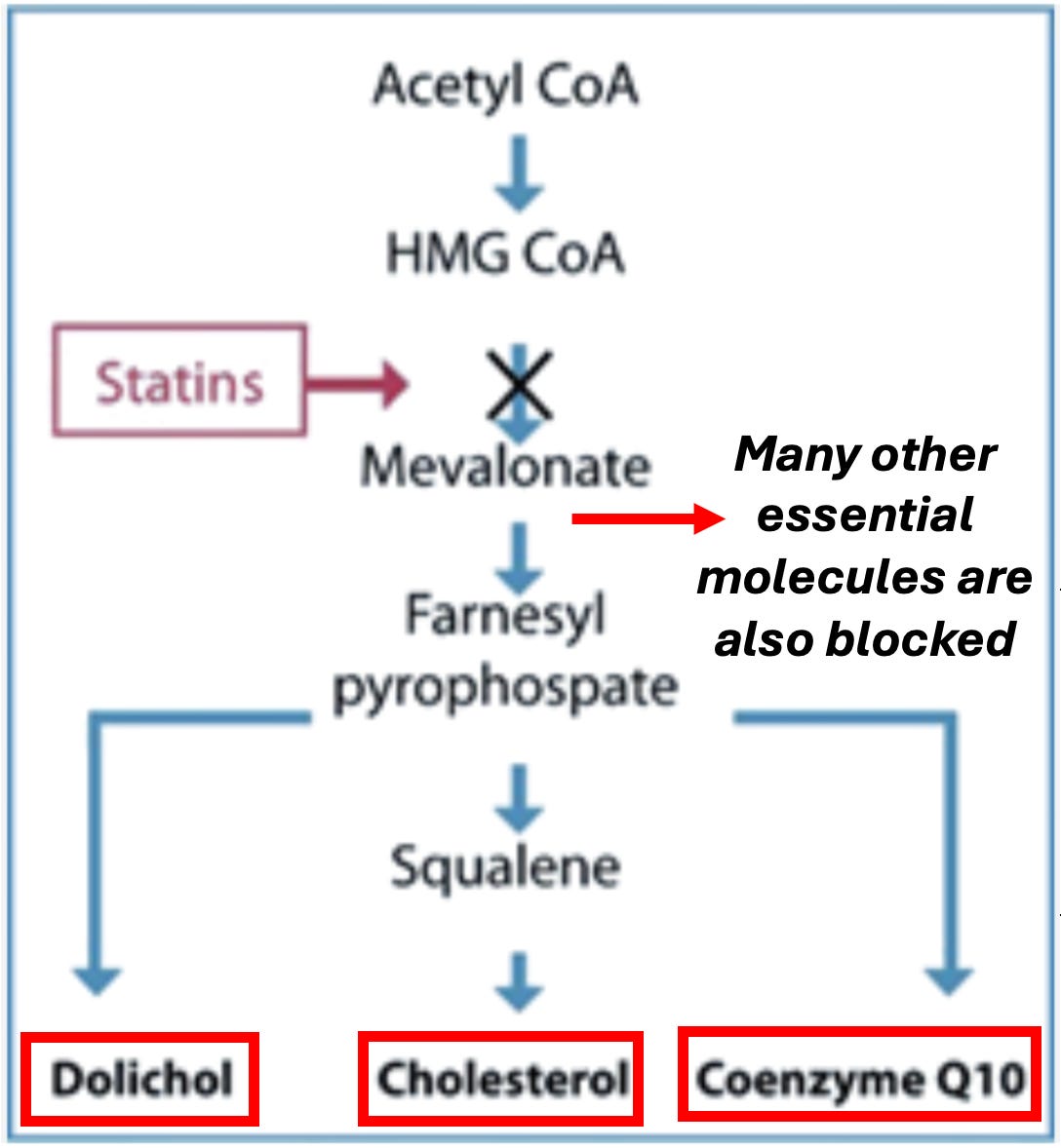 Because of this and other debilitating long-term complications (e.g., previously an extremely fit individual, he developed chronic exhaustion), Graveline became an expert on statin injuries and, in 2014, wrote The Statin Damage Crisis. Many of the points he raised there explain why statins are so dangerous, but unfortunately, are virtually unknown within the medical field. Statin Mechanisms of HarmStatins work by inhibiting an easy to target enzyme that is necessary for the production of cholesterol. Unfortunately, blocking that enzyme disrupts a variety of other vital physiologic processes. Let’s review what that enzyme does: As these compounds are essential for the body, understanding statin toxicity hence requires us to understand what happens when each of these goes missing. CholesterolCholesterol has a few different essential functions in the body. These include: •It is the precursor to many different hormones. •The brain’s synapses (which, amongst other things, form memories) require cholesterol to function. Since cholesterol is too big to enter the brain, glial cells (support cells of the nervous system) synthesize it within the brain. Statins, unfortunately, inhibit glial cell production of cholesterol. •Cognition, in turn, is highly dependent upon cholesterol. For example, one study found that minor cognitive impairment could be detected in 100% of statin users if sufficiently sensitive testing was done (which again illustrates how minor injuries are more common than severe ones). Likewise, a variety of more severe adverse effects on cognition are also observed such as amnesia, forgetfulness, confusion, disorientation, and increased senility.
