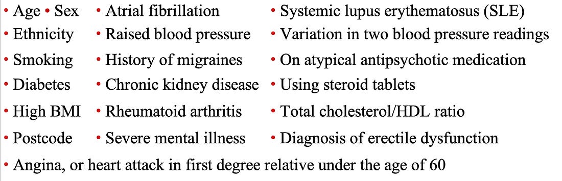 In addition to this arguing that some of the benefit of statins “preventing heart attacks” is due to them causing a fatal cancer before you have time to have a natural heart attack, this situation is somewhat analogous to what was seen with the COVID vaccines (which also cause cancer). There, the “benefit” of the COVID vaccines preventing COVID was outweighed by them causing serious conditions such as heart attacks and strokes, but if one only focused on them preventing COVID (which many did), the vaccines could be portrayed as life-saving, even though they overall did the opposite. Note: although statins appear to increase cancer, one of the few benefits I have seen a lot of evidence for is their prevention of fatal prostate cancer. My best guess is that this is due to them blocking the production of hormones in the body, and that outweighs the effects of them inhibiting NF-kB. “Cholesterol” PlaquesOne of the tricks to creating a lucrative drug market is to instill a belief throughout the population that everyone can relate to which sells your product. For example, the antidepressant industry spent years convincing the public depression was due to a “chemical imbalance” and because of how successful this campaign was, many sincerely believe it to be true even though it is a complete and utter fabrication. One of the cleverest campaigns I’ve seen within the medical industry is the widespread belief that heart disease is due to fat clogging the arteries much like they do for a drain pipe. This marketing slogan in turn is remarkably persuasive as it is easy to understand (to the point that people without a medical background will feel confident repeating it to others), easy to visualize, and highly likely to elicit an immediate sense of disgust. However, given that there is no link between cholesterol and heart disease, is it necessarily true? As one of my favorite authors in this field (Malcolm Kendrick) was pondering this question, he looked at another mystery of cardiology—the fact that there is no common thread between the well-known risk factors for heart disease. For example, to calculate the risk of heart disease, England uses a calculator that combines the adjustable risks for heart disease (e.g., age) with the conditions commonly associated with causing heart disease. Likewise, in a 2017 study, the records of 378,256 English patients were analyzed by an AI system to determine what characteristics put them at the highest risk for a cardiovascular incident in the next 10 years. From that, they found that the ten greatest risk factors (in order) were: From