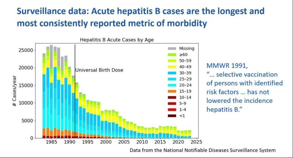 Cases of hepatitis B started to decline (beginning in 1985) well before the birth dose was implemented—down 33% by 1991 using targeted vaccination of at risk populations. The birth dose of the vaccine played no role in this decline. In fact, the incidence of acute hepatitis B in the United States declined as much as 80% between 1987 and 2004.