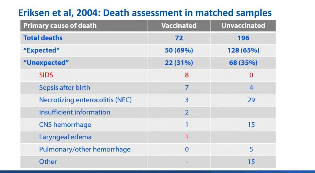 In the Eriksen et. al. study, there was a lower death rate in the unvaccinated group. There were more deaths due to SIDS in the vaccine group as compared to the unvaccinated group. In this study, the infants that were unvaccinated was generally because they were unhealthy or low birth weight.