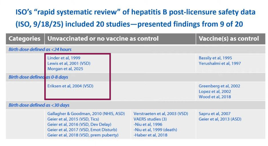 Twenty publications were found during a rapid systematic review of published literature for post-licensure safety data for the hepatitis B vaccine birth dose with 9 studies restricted to dose on day of birth (within 24 hours). Only 4 studies were reviewed in the presentation (see red box).