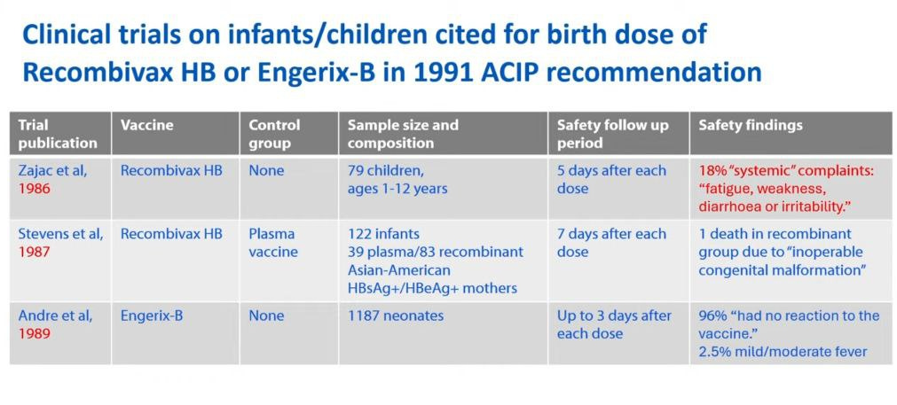 There were 3 studies in the 1980’s that were used for the birth dose vaccination but they had a low number of participants and short follow-up periods of 7 days or less with no ability to assess late onset or chronic conditions.