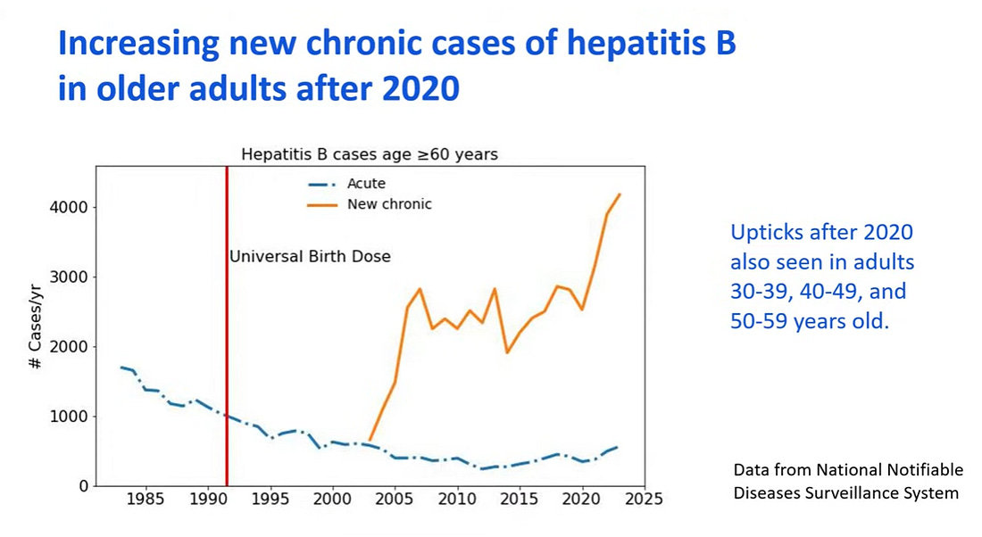 Collection of data on chronic cases of hepB in the US started only as recently as 2003. There was an uptick of cases but in older adults, those over 60 years of age while they observed an uptick of cases starting at age 30 beginning in 2020.