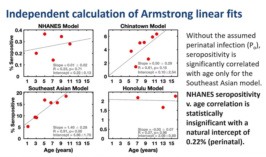 The NHANES model represents a typical American child and the fit is nearly a flat line meaning no risk of horizontal transmission. Horizontal transmission was only seen in one model, the Southeast Asia model which was conducted in communities with high rates of immigrants.