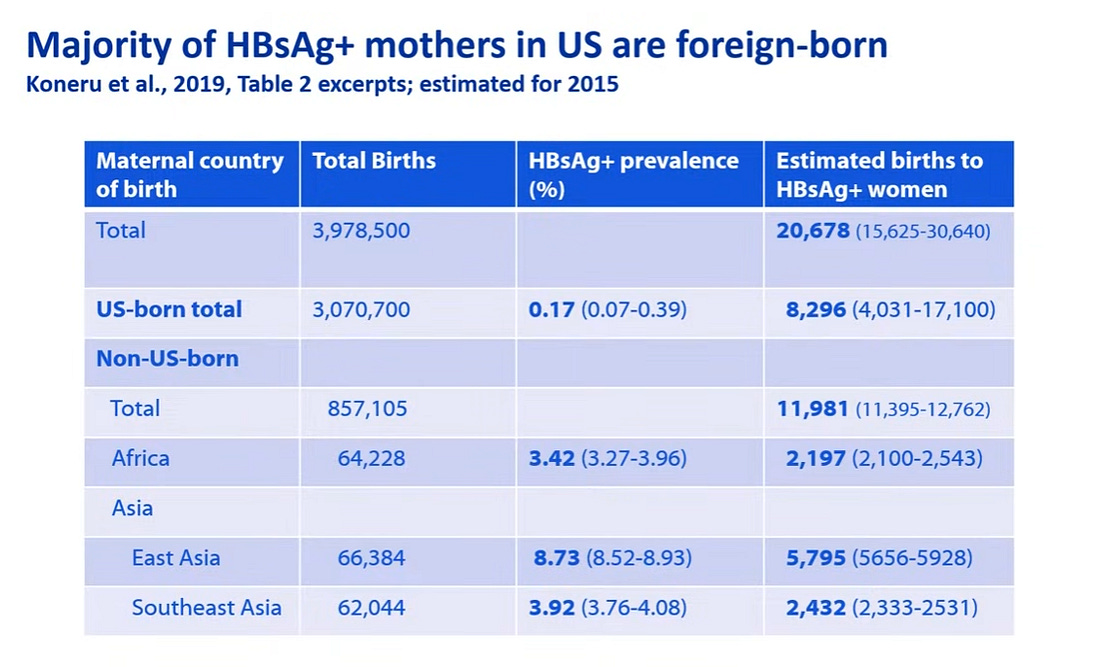 One study published in 2019 estimated the number of births to HBsAg+ women in the US. It showed that an estimated 20, 678 infants were born to HBsAg+ women in the US, representing 0.5% of all births (approx. 4 Mil births total).