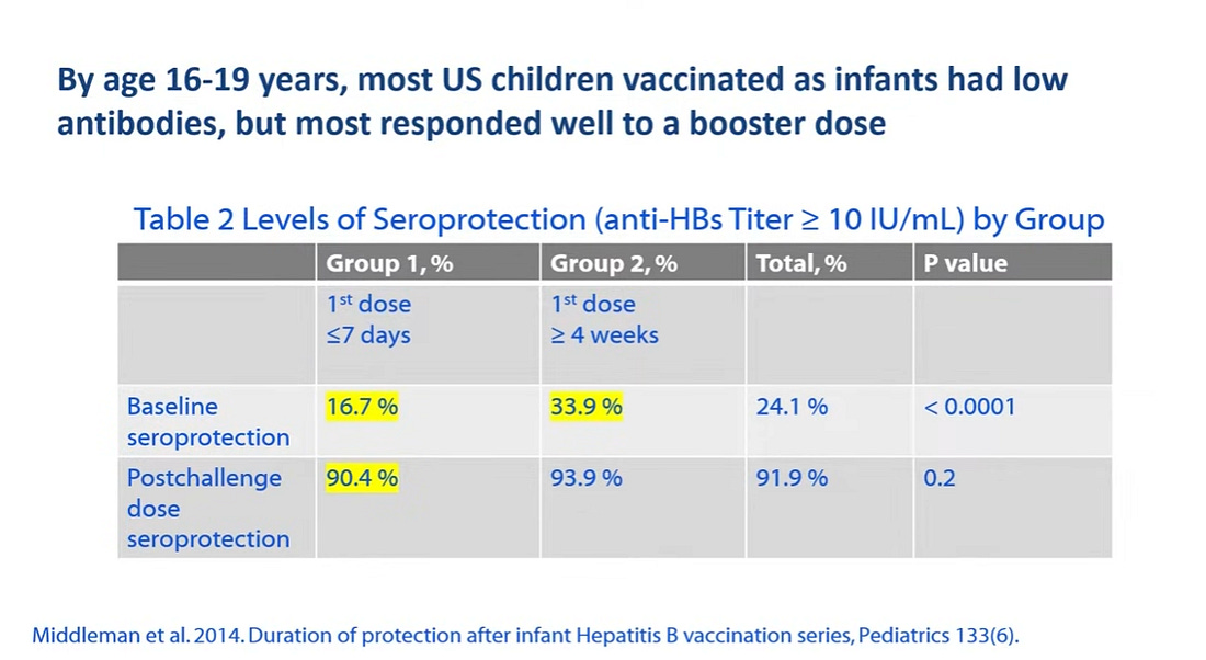 Antibody titers waned most rapidly in children who begin the primary series as infants, especially when vaccinated as newborns. Of children in the US vaccinated as infants, less than 17% had antibody titers at 16-19 years of age.