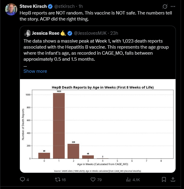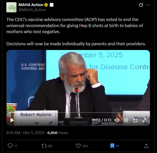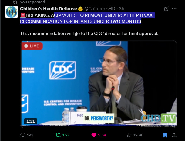 Great news. ACIP voted 8 to 3 to end the universal HepB vaccine recommendation for infants under two months.
