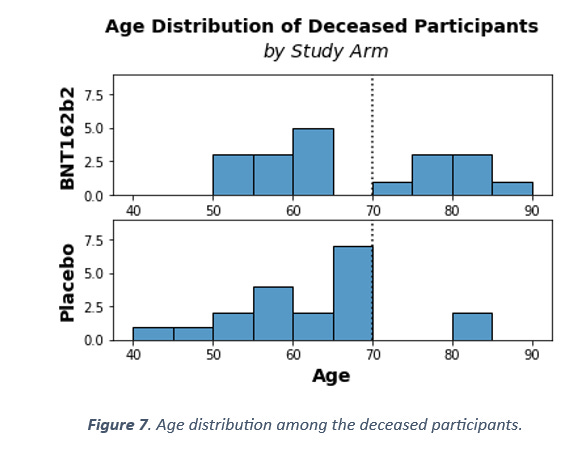 There are at least two unlikely patterns in Figure 7. The first is that only two people above 70 years of age died in the placebo arm, as opposed to eight in the vaccine arm. The distribution should be random and equally probable, so according to the binomial distribution, the probability of such a pattern to arise from chance alone is p = 0.1 – not alone significant, but unlikely. The second unlikely pattern is that 7 people between the age of 65 and 70 died in the placebo arm and none died in the vaccine arm. This is even more unlikely, at p = 0.016.