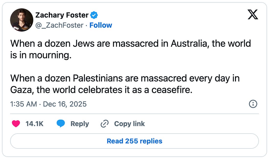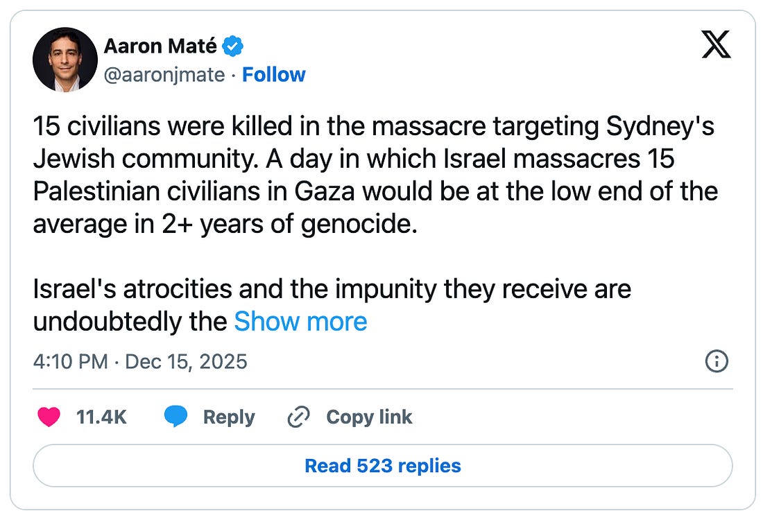 “15 civilians were killed in the massacre targeting Sydney’s Jewish community. A day in which Israel massacres 15 Palestinian civilians in Gaza would be at the low end of the average in 2+ years of genocide.