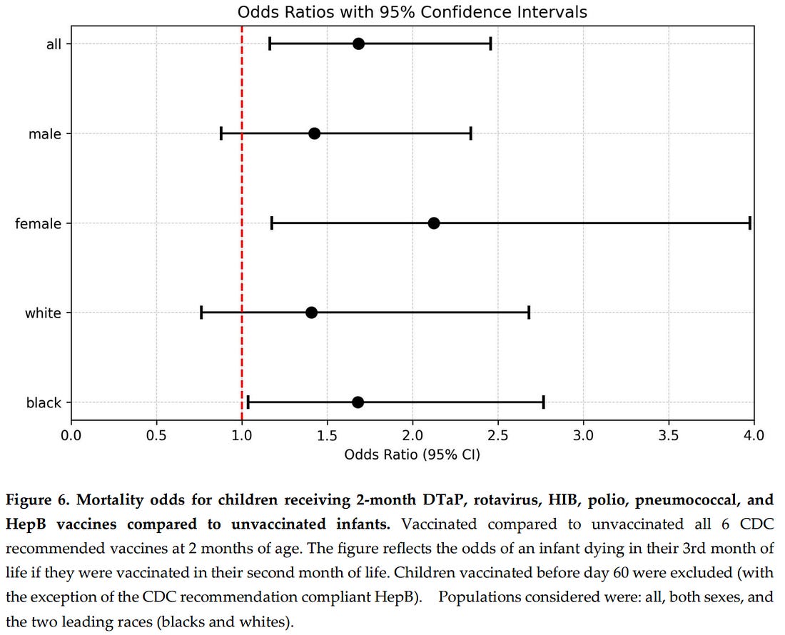 Most alarming, infants who received all six recommended 2-month vaccines had a 68% higher odds of death overall (OR = 1.68; p = 0.0043), with the risk surging to +68% in Black infants and +112% in female infants (OR = 2.12; p = 0.0083).