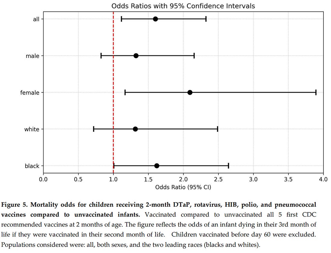 Infants vaccinated at 2 months showed consistently higher odds of death in the following month, with statistically significant risk increases spanning individual vaccines, cumulative exposure, sex, race, and combination products.
