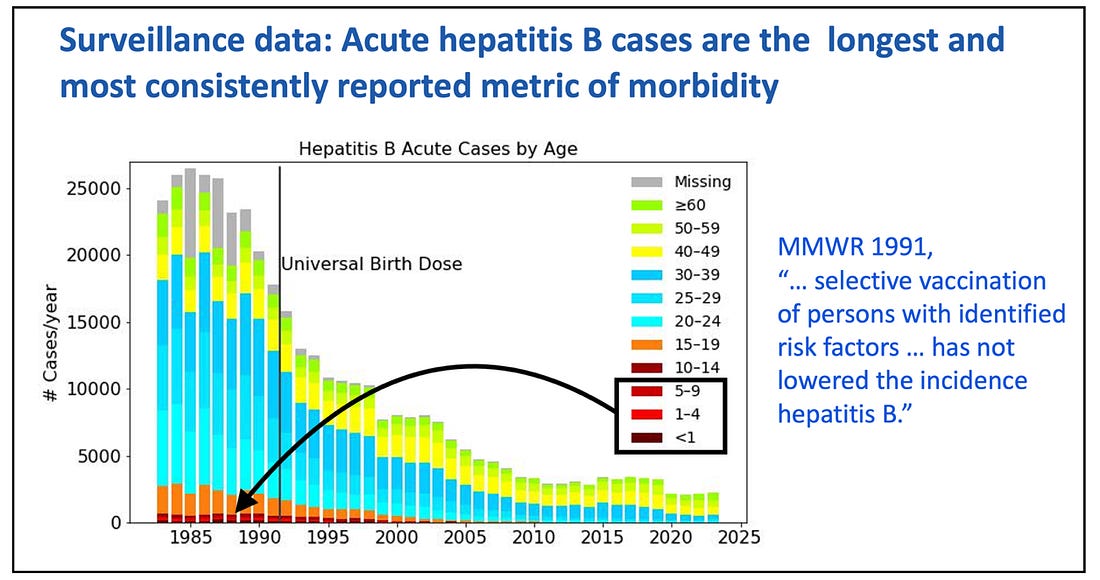 The national surveillance system (NNDSS) shows acute hepatitis B cases in children under 10 were extremely low — around 400 per year — before the universal birth dose was introduced.