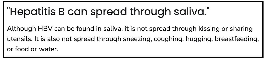 Hepatitis B is not transmitted through casual contact. While HBV DNA can appear in saliva, real-world transmission requires blood-to-blood or sexual exposure— not the everyday interactions Offit invoked.