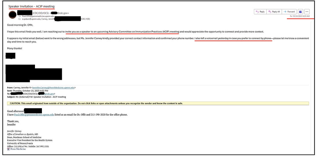 On 23 October, a CDC official emailed Offit with the subject line “Speaker Invitation – ACIP meeting.” The message was explicit: “I am reaching out to invite you as a speaker to an upcoming ACIP meeting and would appreciate the opportunity to connect…”