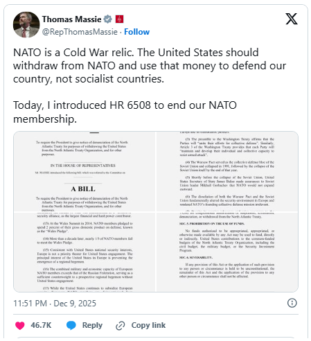 So Massie makes a good point. What sense does it make for America, $38 trillion in debt, to subsidize Europe’s security? Why should Americans, who are fighting for their own country’s liberty and traditional values, protect a slew of nations that are becoming more tyrannical by the year? What sense does it make for Americans to protect a group of countries that are targeting American companies with outrageous fines for allowing free speech? These are not the actions of free societies, they are policies reminiscent of the Soviet Union. And what sense does it make to continue participating in an alliance that has no qualms with dragging our men and women to die on their continent?