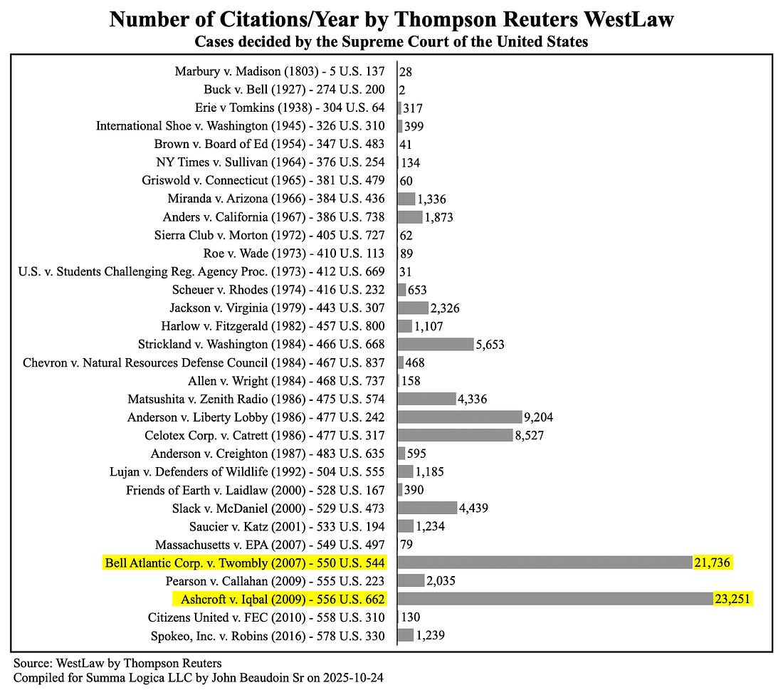 I rarely write articles in the first person. Yet, this article cries for it. The subject matter is too important and author bias unavoidable. The Supreme Court will decide on January 9 whether my case, Dkt. 25-600, will move forward to be heard. With due respect to all other Supreme Court justices, I selected Justice Neil Gorsuch to go up against Pareto efficiency in this article’s title because I find his decisions and opinions to be refreshing. Everyone has to have a favorite, right? Pareto efficiency, named after economist Wilfredo Pareto, occurs when no change to any input can make a system more efficient. The Pareto efficient system is tuned to its optimal efficiency. The important factor is the economic objective to which Pareto efficiency is applied. In my article, Habitual Dismissals of Meritorious Cases are Tearing America Apart, I proved empirically that 2020 brought far more civil cases than the U.S. Court system could handle (~180,000 extra cases). See Figure 1 below. The only possible conclusion is that most of those cases were dismissed in violation of the Constitutional rights of the plaintiffs. The case citation rates in the article further verify such a conclusion. See Figure 2 below. Thus, the objective to which Pareto efficiency manifested in U.S. courts is “dismissals of meritorious cases,” not justice and equity, which is the mission of the courts. In fact, the Pareto efficient dismissal doctrine now employed by U.S. courts razes and consumes justice and equity. Civil procedure is a beast, out-of-control and ravaging the rights of The People to access the courts for dispute resolution. Disputes wrongly dismissed result in continued abuse of plaintiffs, else the dispute is resolved in the streets. I hope to publish a book in 2027 or 2028, furthering the analyses in my Petition for Writ of Certiorari and the “Habitual Dismissals …” paper, with chapters analyzing over-consolidation, unwarranted protective orders, video conference court, rational basis, and other procedural injustices. I know of no other analysis that empirically proves that the U.S. Courts are far astray from their mission of justice and equity. If Justice Gorsuch or any other Supreme Court Justice views the graphs in Figures 1 & 2 below, republished in this article, then they may understand the vital importance of fixing the U.S. courts. The quotes and citations in my Petition for Writ clearly indicate that the Justices know that “failure to state a claim” and other dismissal doctrines significantly thwart justice. Civil unrest is getting worse in the United States as the courts reject cases on rules of procedure, evidence, and summary judgment. Though I seek a small, reasonable, and incremental change, the change would impact the operations of the courts to realign their Pareto efficiency objective toward justice and equity for The People, rather than dismissals for errant and purported judicial economy. I fear that no attorney will bring such an analysis or solution in the balance of my lifetime and that the United States will continue to degrade deeper into the chasm of civil unrest. The republic may even fracture because The People lack access to dispute resolution in the courts. My Petition is supported by no Amicus briefs. I am in a pro se posture, usually not taken seriously by the Court in civil cases. And the Court frowns upon changes to mandatory authority. Id est, my chances to be heard are very low, despite being the only one to bring such important analyses and potential solutions. Judges and attorneys know there is a major issue with “standing,” “failure to state a claim,” and other dismissal doctrine such as qualified immunity, mootness, ripeness, and others. They will not step forward to challenge the known issue. They get paid regardless of the issue. Judges avoid trials. Attorneys avoid trials. Bullying and coercion in mediation and settlement are now the norm, not fair trials before juries of peers. If not my case, then which case will be brought to fix the system? If not now, then when? By their own written words, Circuit Judge Janice Rogers Brown, the late Ruth Bader Ginsburg, and Supreme Court Justices Samuel Alito and Neil Gorsuch agree that dismissal doctrines are abused by the lower courts. Without correction soon, the Roberts’ Court from Twiqbal 2007 and 2009 will be known for causing the fracture of the republic due to lack of access to the courts. To Justice Gorsuch and other Justices, The People need you now more than ever to fix what was so obviously broken in 2007 and 2009. Twiqbal were two of the most significant mistakes in the history of U.S. jurisprudence. The decisions per se were not mistakes, and were both correct. The mistakes were in the allowance of broad application that ensued thereafter. The twin beasts need to be brought under control and narrowly tailored. Please help us. The People need a win for our rights after the Covid era decimated them. Regardless of an ultimate decision, just hearing a pro se petitioner on this matter of procedural dismissals will go a long way to show The People the Court is of The People and the Constitution. Let the U.S. Court system begin healing. God Bless you all John 14:6 TRUTHYou're currently a free subscriber to The Real CdC’s Newsletter. For the full experience, upgrade your subscription. |