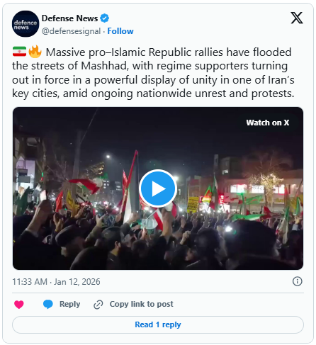 While CIA front groups continue to supply the Western media with reports of large protests in cities such as Mashdad, the reality on the ground is otherwise. Here’s a video from Mashdad recorded earlier today (nighttime in Iran) of pro-regime elements filling the square: