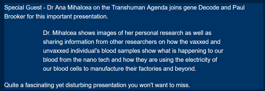 You can find the interview here: The Transhuman Agenda With Gene Decode and Paul Brooker It was a great pleasure to do this presentation with Gene Decode, Paul Brooker and team and we had a great Q&A following it. You're currently a free subscriber to Humanity United Now - Ana Maria Mihalcea, MD, PhD. For the full experience, upgrade your subscription. |