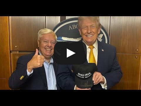 Senator Graham recently tweeted a photo of himself grinning with the president, who was holding a hat which said “MAKE IRAN GREAT AGAIN”. You can pretty much determine how warlike the US empire is from day to day by looking at the expression on Lindsey Graham’s face, and lately he’s been looking positively ecstatic.