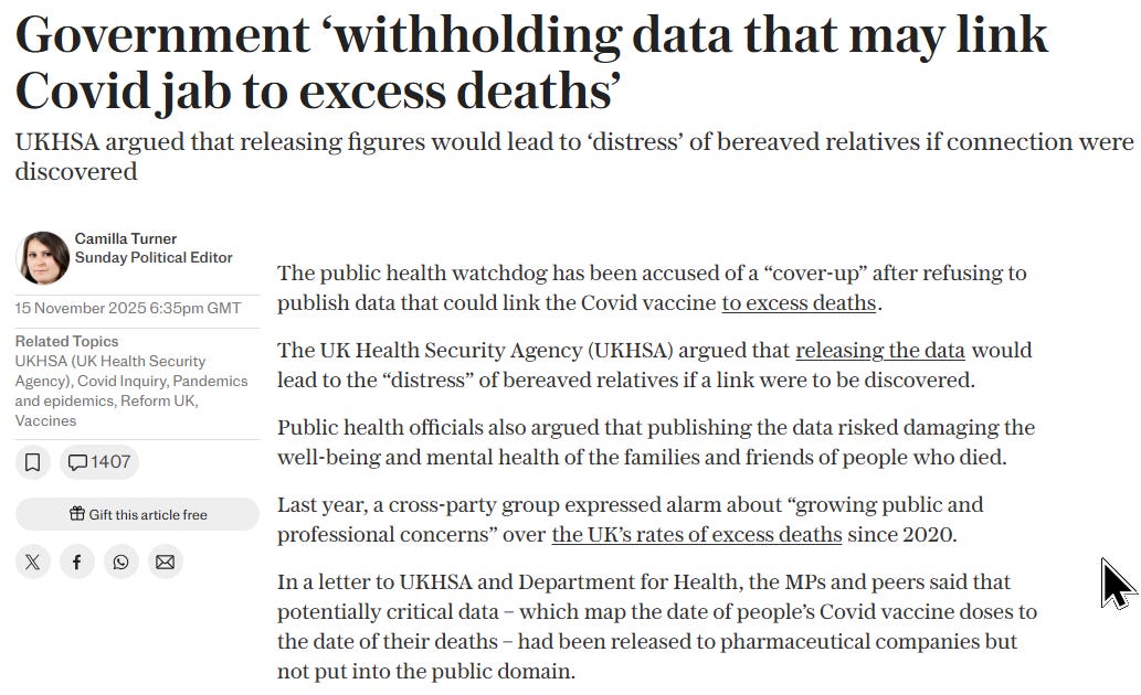 UK government still ‘withholding data that may link Covid jab to excess deaths’UKHSA argued that releasing figures would lead to ‘distress’ of bereaved relatives if connection were discovered. But the Czech Republic showed UKHSA is wrong. They should release the data now.Executive summaryThe UK government keeps the COVID vaccine data secret from the public because releasing the data risks damaging the well-being and mental health of the families and friends of people who died. Wow. What the Czech Republic DidThe Czech Statistical Office (CZSO) and Institute of Health Information and Statistics (ÚZIS) released anonymized, record-level data that matched individuals’ vaccination records, Covid test results, hospitalizations, and mortality records. The Czech data release included: