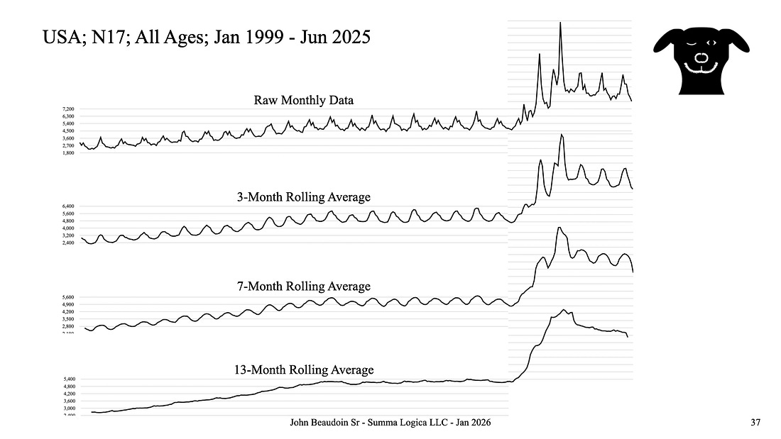 U.S. Sudden Kidney Failure Involved Deaths USA over a 26.5-Year SpanAKI Signal 1 and Signal 2 explained quicklyHappy New Year 2026. I am going to try to put content out on Substack more frequently. Here is yet another Acute Kidney Injury (AKI) article, though very short. There is no question that there is a major issue with AKI and that 255,000 excess Americans lost their lives involving AKI. I devised a new system for some research I’m working on and this will allow me to test across more variables over a longer period of time. This data is derived from CDC Wonder. Figure 1 depicts January 1999 through June 2025 for all United States deaths involving ICD-10 code prefix, “N17,” meaning “Acute renal failure,” better known in hospital settings as “Acute Kidney Injury,” or AKI. The top graph is raw monthly data plotted. Monthly data is itself a way to curve smooth daily death data. Detail is lost as more data is aggregated. Daily would be the best we could hope for. However, it would be interesting to get hourly or to-the-minute data. I bet we could find patterns of what time of day people in different age groups die.Notice that the 3-month and 7-month rolling average graphs, second and third from the top, smoothed the sharp edges of raw data and are beginning to look like sine waves. From 1999 through 2019, the curves are very deterministic. There are 20 years of deterministic and stable signal until 2020, the first year of Covid. P (period) for the waves is exactly 12 months. When the curve smoothing range is greater than P, the seasonality is lost. See the fourth graph from the top, or last graph. Notice the sharp increase in 2020 and 2021. I did not label years because I want the reader to concentrate on disambiguating signals in these graphs. Signal 2 is the sharp rise in the fourth graph, 13-month rolling average, continuing to the end of the graph. Signal 1 is almost gone in the 13-month rolling average, or I should say that it is not noticeable as to what it really is. The area under the graph still is the same in each plot, but the shape is muted. The area under the graphs is the total number of people who died. In the raw data plot at the top, you see two very sharp peaks. That is Signal 1. A graphical representation should clear up any confusion. Figure 2 explains it all. There are at least two signals. Signal 1 is coincident with waves of Covid, but not the first wave in many locations. Signal 2 is coincident with the uptake and vaccination status of the population over time. The two combine for an excess greater than 255,000 dead Americans. Regardless of my assessment or attribution, the timing of these signals do not align with Covid as the cause. A disease cannot select which wave it will then induce harm into kidneys. Covid did not decide to skip over age groups and locations for the first season only to kill them en masse in the second or third season. There are other causes of AKI excess besides Covid per se. ConclusionWhile research papers assert that Covid is the cause, the data in this graph set alone is not in line with that excuse. I have many more graphs of age groups and geographically disparate states. Although I think I know what caused this epidemic of AKI, the conclusion here is not to state what caused it. The conclusions are that 1) there are indeed 255,000 excess deaths involving AKI and that 2) the CDC, FDA, CMS, NIH, and HHS have not done anything to investigate this after 3.5 years of pointing this out to them. They have shown a criminal deliberate indifference to the plight of the American people. More than a quarter of a million people are dead and probably millions injured involving this single cause of death, proven by the CDC’s own CDC Wonder data. Yet, there is no action from these agencies whose missions directly align with investigating this mass casualty event. Where is Robert F. Kennedy, Jr. on AKI? Has any big podcaster or voice in the health freedom movement asked him to look into it? Or are they all too busy talking about myocarditis in young, male athletes? God bless you all. John 14:6 TruthYou're currently a free subscriber to The Real CdC’s Newsletter. For the full experience, upgrade your subscription. |